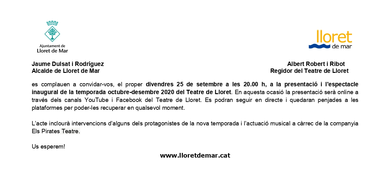 Des del Teatre de Lloret us convidem a la presentació de la temporada de tardor del Teatre de Lloret.